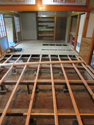 床の根太木を全部新しく張り直して、ベコベコを直しましたぁ~。