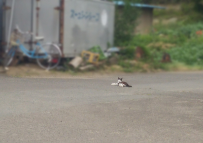 車が来ても、道の真ん中でおくつろぎになってる猫ちゃん。