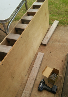 慎重に運ばねばならない作品のための荷積み様備品を大工仕事。